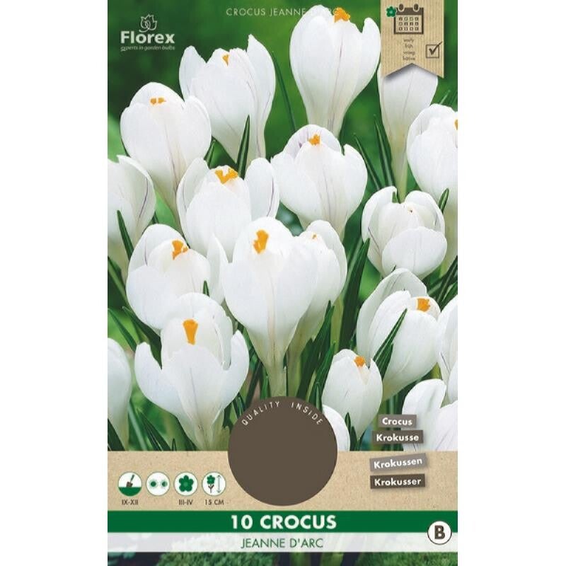 Crocus ‘Jeanne d’Arc’ is een elegante grootbloemige krokus met puur witte bloemblaadjes en een opvallend gouden hart. Een frisse voorjaarsbloeier die uitstekend geschikt is voor borders, gazons en potten.