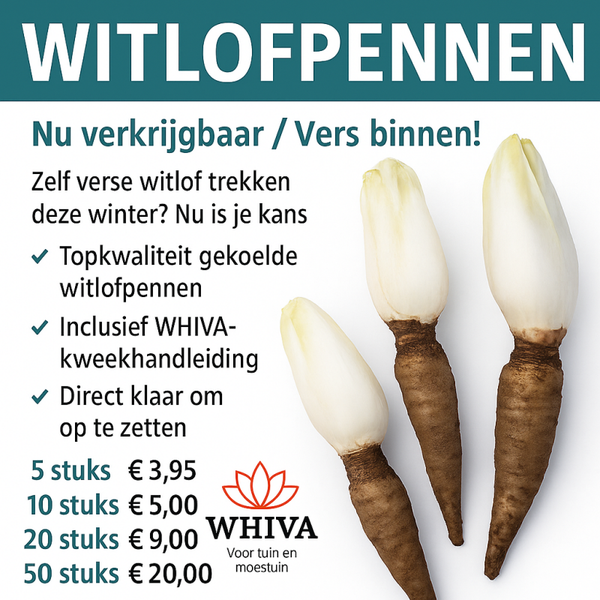 Wil jij deze winter zelf witlof telen? Met onze verse witlofpennen trek je eenvoudig prachtige, witte witlof thuis — in een emmer, bak of pot.